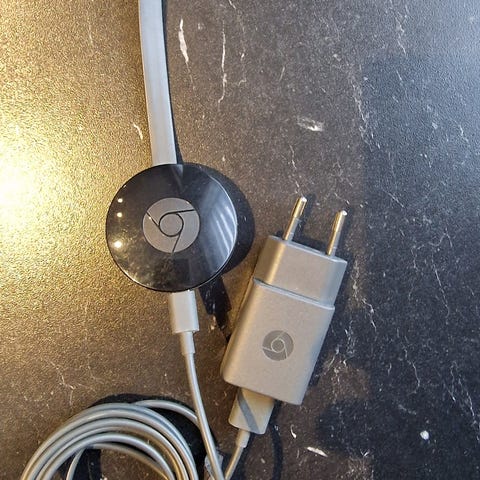 Google Chromecast mediaspelare i svart färg. Enheten ansluts till tv:ns HDMI-ingång och drivs via medföljande nätadapter och USB-kabel. Används för att strömma bild och ljud från kompatibla mobiler, surfplattor och datorer till tv:n över wifi. Stöd för uppspelning från olika streamingtjänster beroende på modell och appstöd. Passar tv-apparater med ledig HDMI-port och tillgång till trådlöst nätverk.
