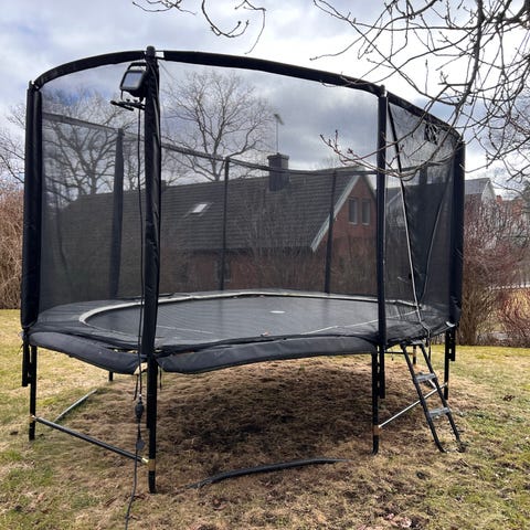 Oval studsmatta i äldre modell från North Trampoline i ok skick. Välanvänd men nät, hoppduk, skydd och fjädrar har förvarats inomhus under vinterhalvåret.