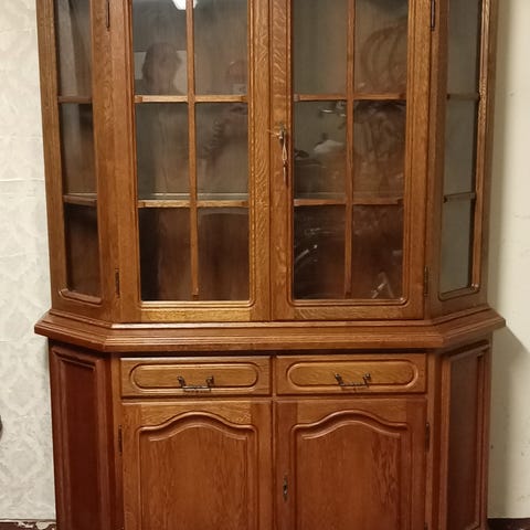 Vitrinskåp bokhylla i brunt trä med klassisk utformning. Överdelen har tre glasdörrar med spröjs och hyllplan för förvaring av böcker, porslin eller prydnader. Underdelen har tre lådor samt tre skåp med trädörrar för dold förvaring. Passar i vardagsrum, matsal eller bibliotek för förvaring och exponering av föremål.