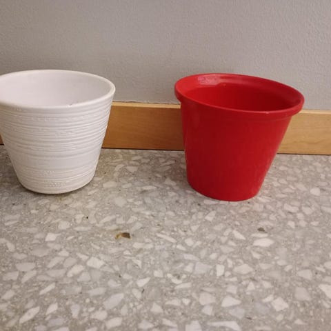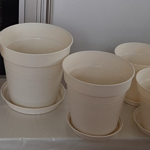 Krukor i olika storlekar i färgerna grå, vit och blå.
