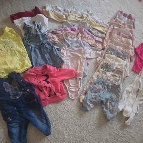 Barnkläder set för flicka i storlek 74. Blandning av långärmade tröjor, byxor och bodys i huvudsak rosa, lila, blått och vitt med olika mönster och tryck. Plaggen passar för vardagsanvändning och kan kombineras till flera ombyten för barn i storlek 74.