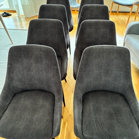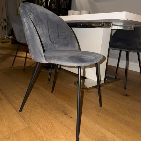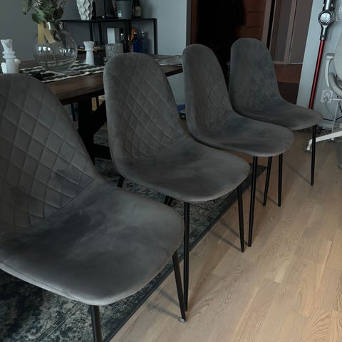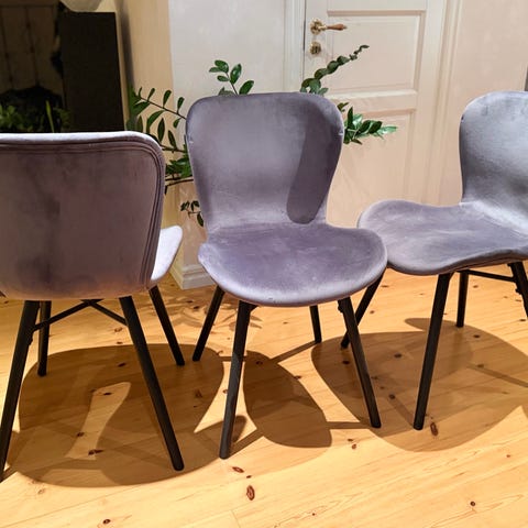 Säljer 4 st matstolar i färgen ljusgrå sammet. Stolarna är rena och har inga skador. Kommer från ett hem som är rök/djurfri. Finns att hämta i Göteborg.