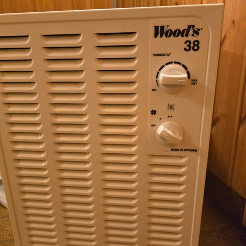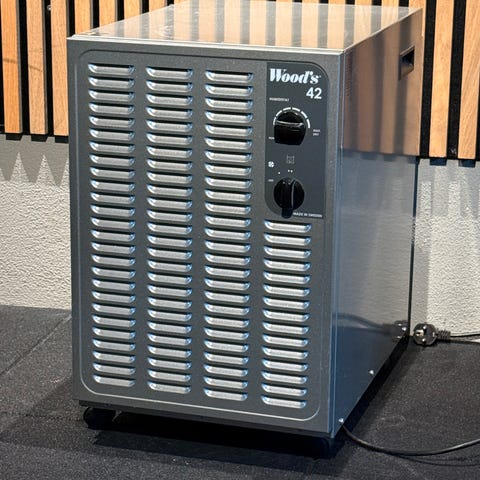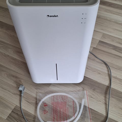 Woods avfuktare med digital display. Enheten är utformad för att sänka luftfuktigheten inomhus och kan användas i exempelvis bostad, källare eller andra utrymmen där fuktnivån behöver kontrolleras. På ovansidan finns en digital panel som visar aktuell luftfuktighet och olika funktionssymboler. Avfuktaren har luftintag på framsidan och ett bärhandtag för enklare förflyttning. Bruksanvisning ingår, vilket beskriver inställningar, funktioner och skötsel av apparaten.