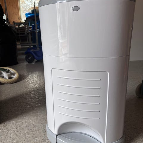 Luktfri blöjhink tillverkad av 98% återvunnen plast, avsedd att slänga använda blöjor och våtservetter i. Enkel att använda och rymmer upp till 28 blöjor.