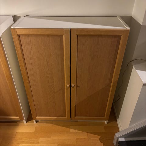 Skåp IKEA Faktum med dörrar i massiv björk. Det står på medar som kan ersättas med ben från IKEA. Det har tidigare varit väggmonterat.