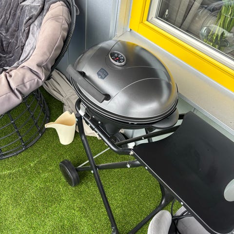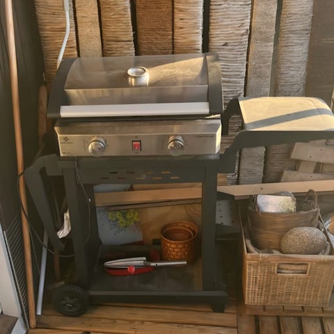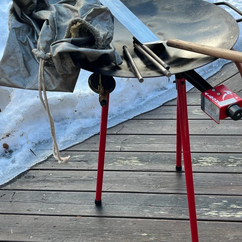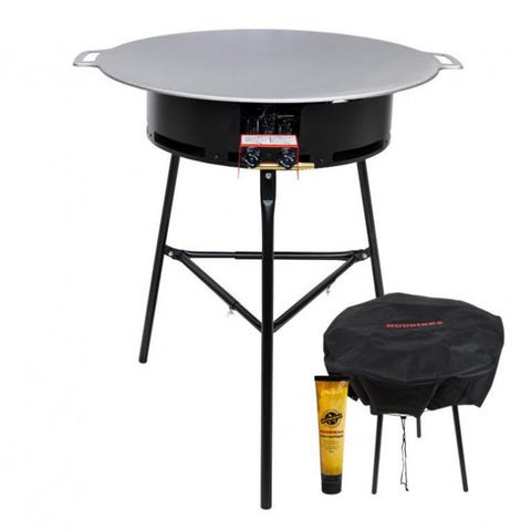Gasolstekhäll i 60cm från Pan Gourmet i gedigen gjutjärn med stativ och två sidobord i trä (sidbord något större än orginalet). Stekhällen har grymt bra effekt och är rund och ansluts till gasolflaska via slang och regulator ingår, ej gasolflaska. Super kul att laga mängder av mat på.