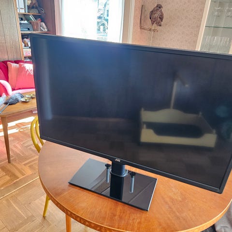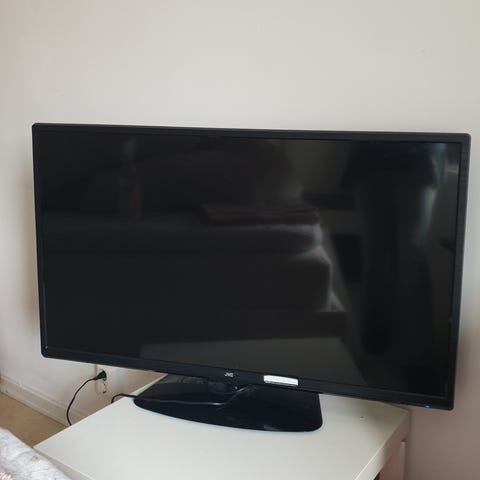 JVC tv med platt skärm. Utrustad med HDMI-anslutning enligt märkningen på baksidan. Passar för anslutning till exempelvis digitalbox, spelkonsol eller dator via HDMI. Färg och exakta mått eller tumstorlek framgår inte tydligt av bilderna.