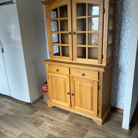 Skåp med glasdörrar i överdelen.
