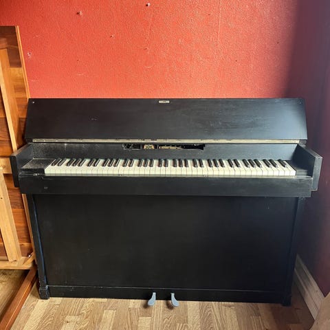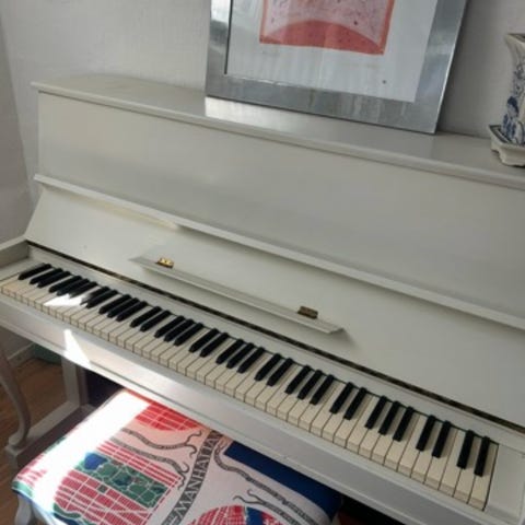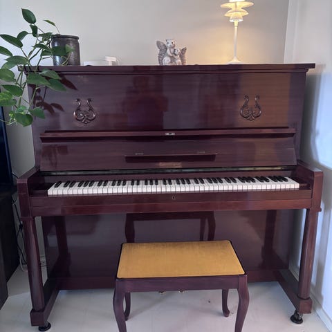 Vackert gammalt piano design. Pianot har dekorativa ljushållare på framsidan. Till pianot hör en matchande pianopall med stoppad sits. Passar som instrument i hemmet eller som inredningsdetalj i exempelvis vardagsrum eller musikrum.