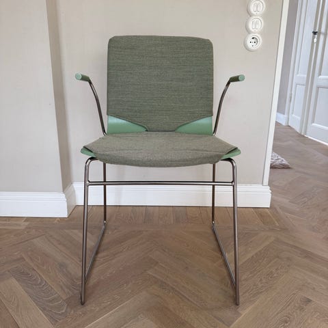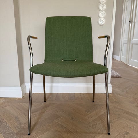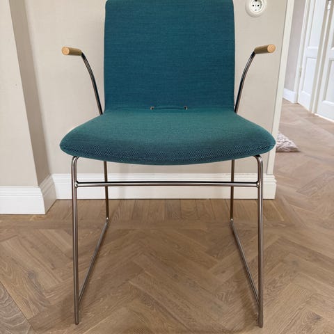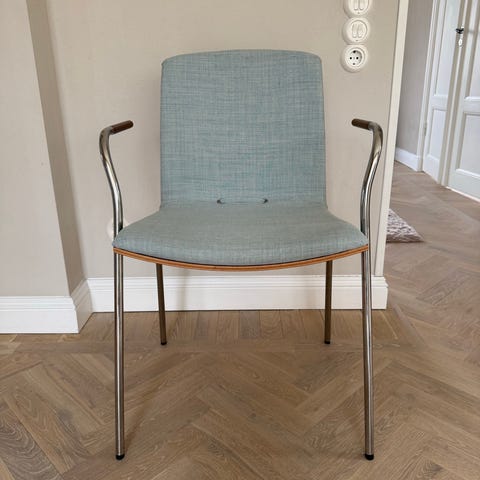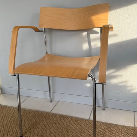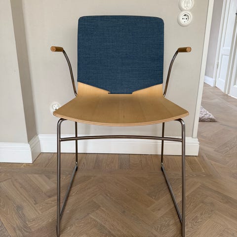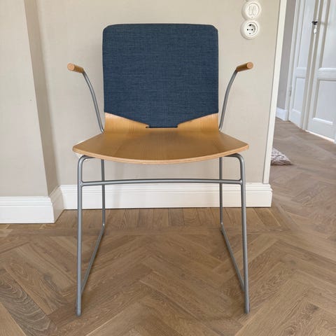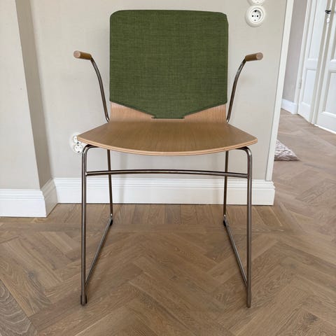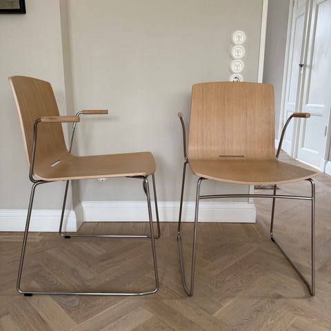 Formpressad skalstol i björk. Armstöd i björk. Medstativ i förkromat stålrör. Stapelbar! Design Pierre Sindre.