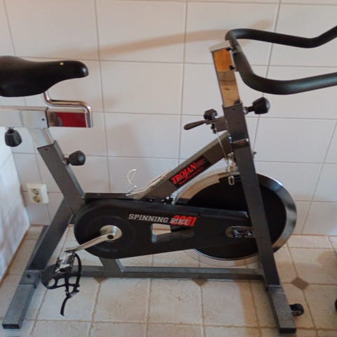 Spinningcykel i röd färg med justerbart styre och sadel. Stabil ram med remdrift och svänghjul framtill. Passar för inomhusträning och konditionspass i hemmet. Pedaler med remmar för bättre fotfäste. Placeras direkt på golv, lämplig för användning i exempelvis vardagsrum eller träningshörna.
