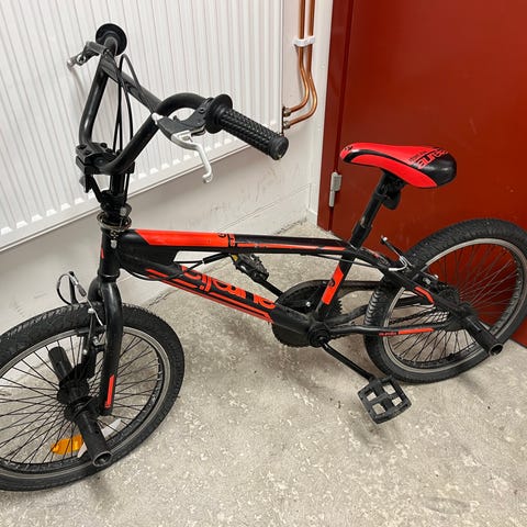 Barncykel BMX med 18" hjul. Cykeln har ram i grå färg med svart styre, sadel och hjul. Utrustad med grovmönstrade däck och fotpedaler anpassade för barn. Passar som barncykel för vardagscykling och enklare BMX-åkning.