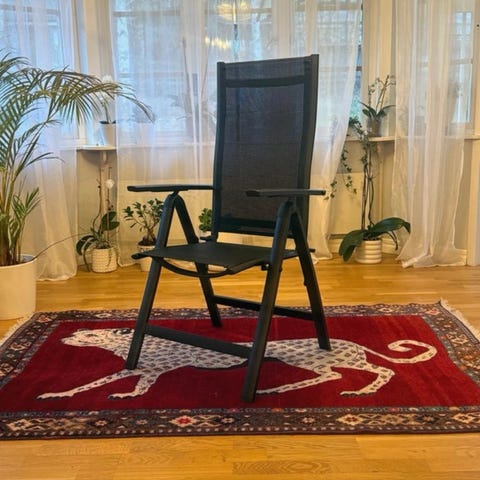 Fällbar solstol med randigt, flerfärgat tyg. Stolen har metallstomme och tygsits/ryggstöd i vertikala färgade ränder. Passar för användning på altan, balkong, trädgård eller strand. Stolen är hopfällbar för enklare förvaring och transport.