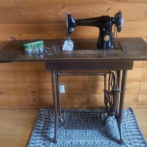 Singer symaskinsunderrede i gjurjärn med träskiva i ek.
