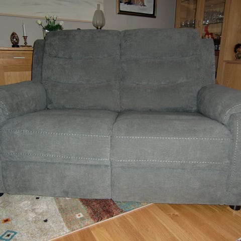 Säljer en mycket bekväm 3-sits soffa i grått tyg. Två av sittplatserna har reclinerfunktion (utfällbart fotstöd) – perfekt för avkoppling.