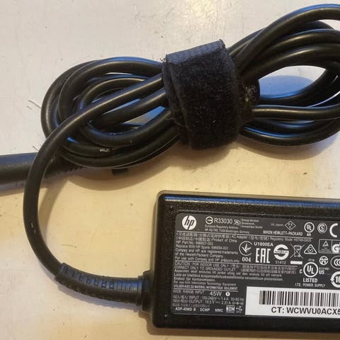 HP laddare, 65 W med 7,4 mm stift. 100 % ok.Även till Dell