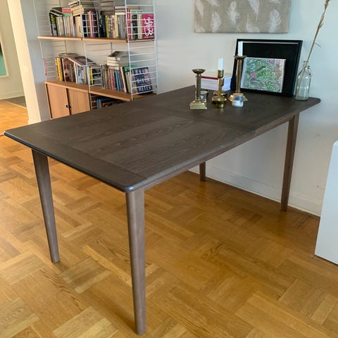 Bordsskivan är i laminat och har lite märken, se bilder. Jag har försökt att fylla i med bättre färg matchning på kanterna.