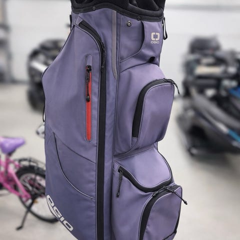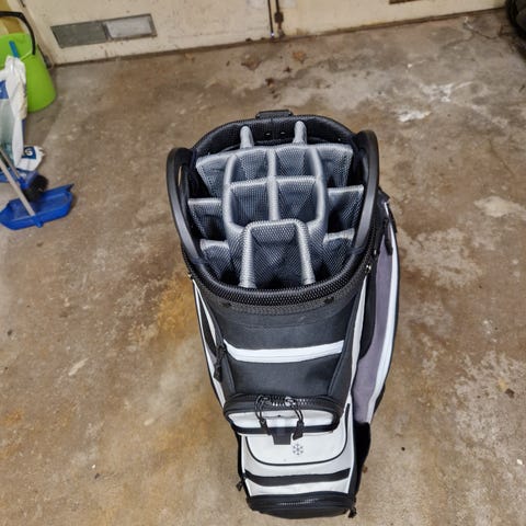 Golfbag Cobra, av typen vagnbag i grå och svart färg. 14 fack upptill för klubbor samt flera ytterfickor för tillbehör. Bagen är avsedd att användas på golfvagn eller golfbil och ger organiserad förvaring av klubbor, bollar och annan utrustning under spel.