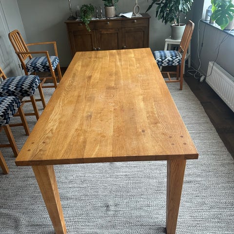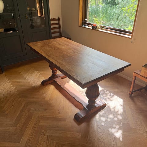 Matgrupp bestående av ett större matbord i trä, troligen furu, med rektangulär bordsskiva och svarvade ben med metallbeslag. Till bordet hör sex trästolar med stoppade sitsar klädda i tyg med mönster. I samma stil ingår ett vitrinskåp/skänk i furu med öppna hyllplan upptill för glas och prydnader, lådor i mitten samt förvaring för flaskor och skåpsdel nertill. Passar som komplett matgrupp för kök eller matsal med förvaring för glas, böcker och vinflaskor.