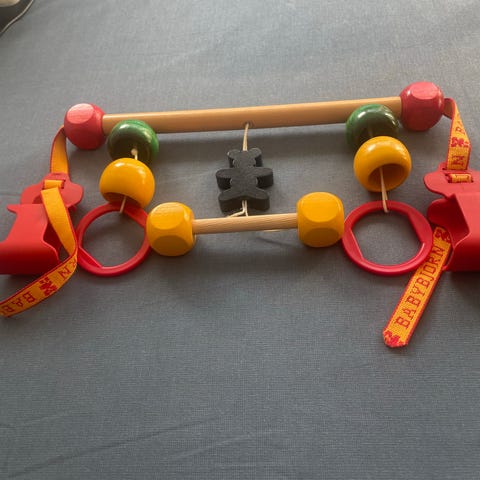 BRIO leksak hängande träleksak med ringar i flerfärgat trä. Består av en horisontell trästav med upphängningsband i båda ändar. Under staven hänger flera trädetaljer i olika former och färger samt två röda ringar. Leksaken är avsedd att hängas upp, till exempel över spjälsäng, lekhage eller annan plats där små barn kan nå den och greppa, skaka och utforska de olika delarna.