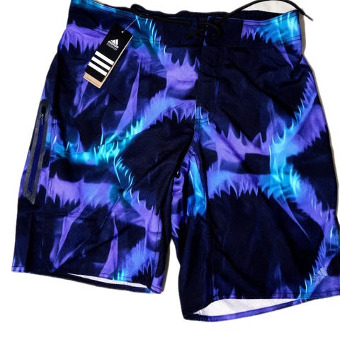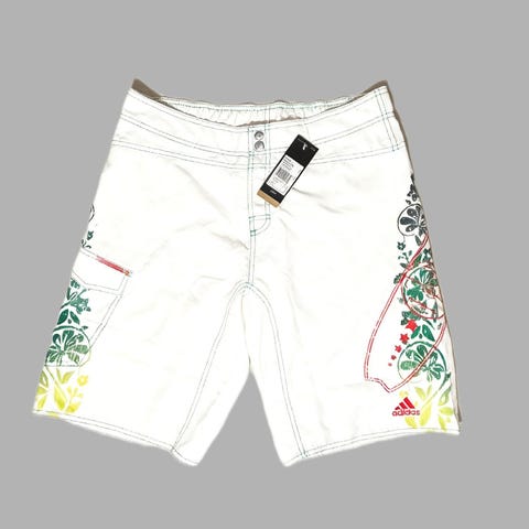 Adidas Performance boardshorts i vitt med tropiskt grafiskt print. Metallknappar, grön söm, ficka på sidan. Nyskick med lapp. Skickas eller möts upp.