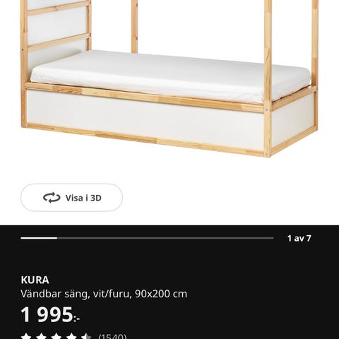 IKEA Kura våningssäng för barn. Modellen är vändbar och kan användas antingen som låg säng eller som högsäng. Mått ca 90x200 cm. Utförande i vit och furu, med träram och paneler. Passar standardmadrass 90x200 cm och är avsedd för barnrum där man vill kombinera sovplats med möjlighet till lek eller förvaring under sängen vid hög montering.