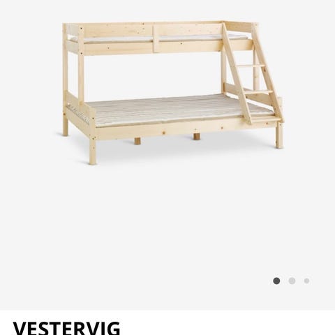 IKEA Mydal våningssäng i vitlaserat trä. Sängen är avsedd för två madrasser i storlek 90x200 cm, en nedre och en övre bädd. Konstruktionen består av träram med integrerad stege på sidan och skyddskanter runt övre bädden. Passar som platsbesparande lösning i barnrum, gästrum eller andra utrymmen där två sängplatser behövs på liten yta. Levereras med tillhörande beslag för montering enligt bilder.