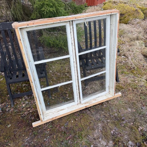 Träfönster med spröjs i vitmålat trä. Flera glasrutor i klassisk indelning. Vissa partier i träet och färgen visar slitage och kan behöva renovering eller ommålning. Passar exempelvis till renovering av äldre hus, friggebod eller som dekorativt inslag i trädgård eller inomhusmiljö.