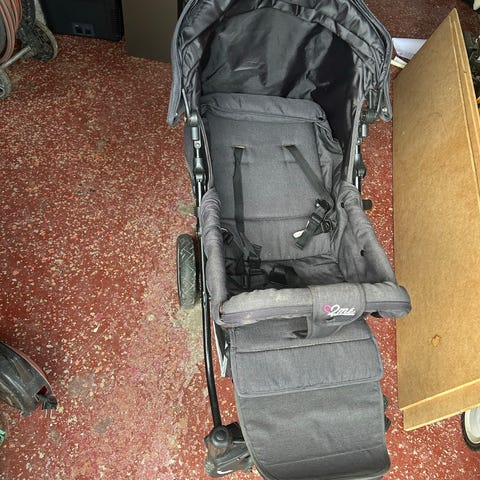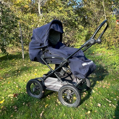 Barnvagn med ligg- och sittdel i blå. Finns sele samt fotsack.