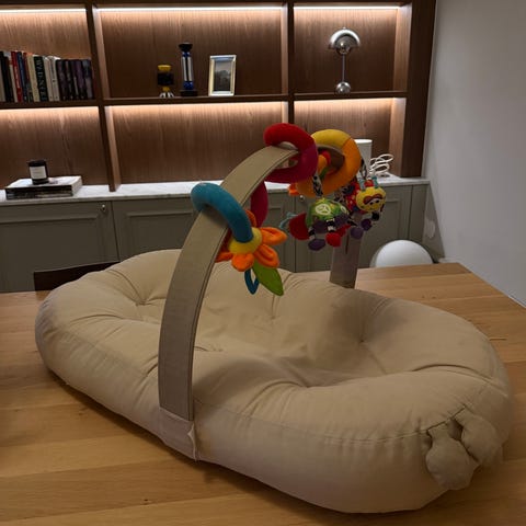 Done by Deer babynest i ljusgrått tyg med diskret prickigt/melerat mönster. Babynestet har mjuka, vadderade kanter runtom och en plan liggyta i mitten. Yttertyget ser ut att vara i bomull eller liknande mjukt material. Passar som trygg sov- och viloplats för spädbarn i exempelvis säng, soffa eller barnvagn. På bilderna syns även en svart åkpåse/fotpåse med ljus insida, anpassad för användning i barnvagn.