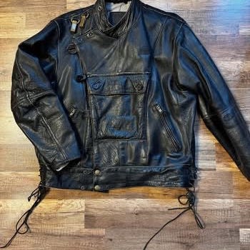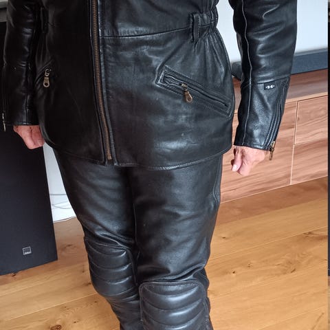 Halvarssons mc-ställ i svart skinn för herr. Stället består av skinnjacka och skinnbyxa i matchande färg. Jackan har bröstficka med dragkedja och präglad Halvarssons-logotyp på bröstet. Både jacka och byxa har flera fickor och detaljer som är typiska för motorcykelkläder, med robusta sömmar och justerbara remmar bak på jackan. Passar för motorcykelkörning och annan användning där slitstarkt skinnmaterial önskas.storlek M 50
