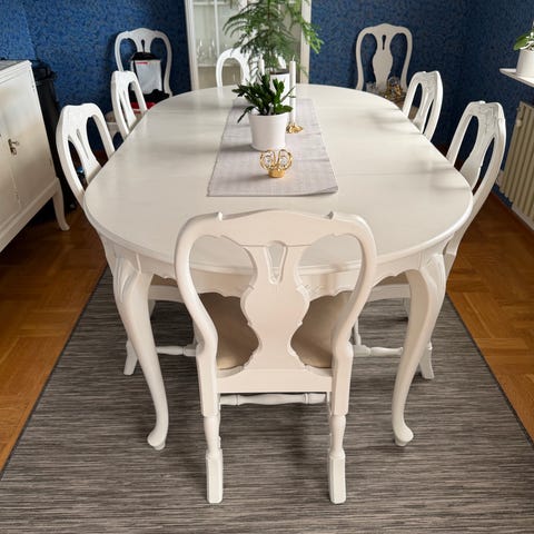 Säljer ett rejält och stilrent matbord i vitmålad massiv trä med 6 matchande stolar. Perfekt för dig som vill ha ett större bord för både vardag och middagar med många gäster.