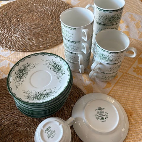 13st Rörstrand tekoppar med fat i porslin med grön dekor. Servisen består av flera koppar och matchande fat med samma mönster. Passar för servering av te vid vardag och enklare bjudningar. Klassisk vit bas med grön bladdekor runt kopp och fat.