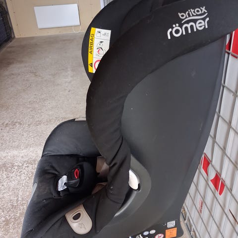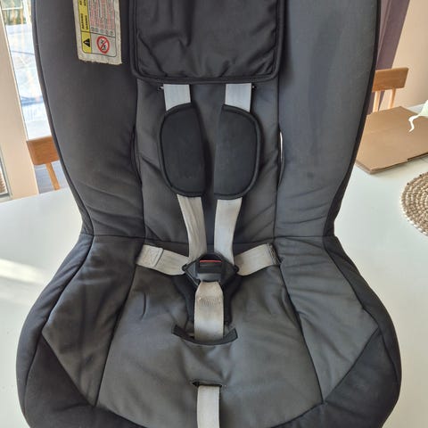 Britax Römer bilbarnstol i storlek 9-25 kg. Bakåtvänd bilbarnstol med intern 5-punktssele och justerbar sele. Klädsel i mörk/svart färg. Monteras med bilens bälte. Använts av ett barn i ca två år. Plastplutten till justeringsstroppen fattas men inget som påverkar funktion. (Se bild framifrån).