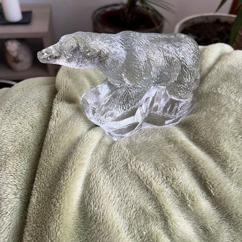 Glasfigurer i form av isbjörnar i klart och blått glas. Figurerna står på små glasbaser och kan användas som prydnader i hylla, vitrinskåp eller på bord. Passar som dekoration i hemmet eller som samlarobjekt för den som gillar glasdjur.