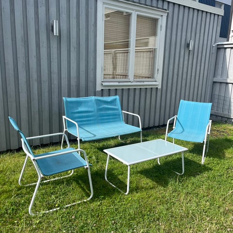 Trädgårdsgrupp bestående av ett rektangulärt bord och fyra stolar i trä, målade i vitt. Bordet har ribbad bordsskiva och raka ben. Stolarna har ribbad rygg och sits samt armstöd. Färgen är sliten och flagnande på både bord och stolar, vilket ger ett väderbitet utseende och kan behöva ommålning. Passar för uteplats, altan eller trädgård.De är robusta tunga och har en ögonfallande charm! Säljes med tjocka dynor till.