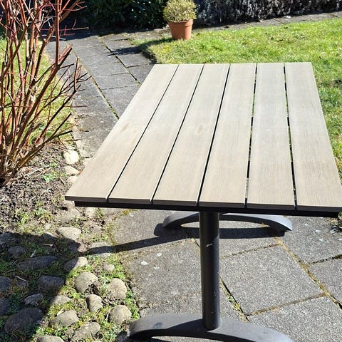 Träbord utebord i rektangulär form i brun träfinish. Bordet har ribbad bordsskiva och fyra raka ben. Passar för användning på balkong, altan eller uteplats som matbord eller avlastningsbord.