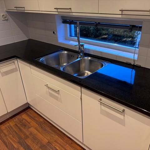 Köksö med svart stenskiva och integrerad diskho. Passar som köksö, arbetsyta och förvaring i kök samt som avdelare mellan köksdel och matplats eller vardagsrum.