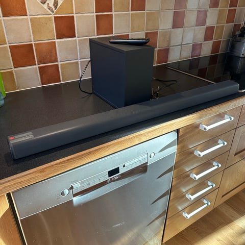 Sony soundbar med tillhörande subwoofer i vit färg. Lämplig för placering framför tv eller på tv-bänk. Systemet ger förstärkt ljud för tv, film och musik.