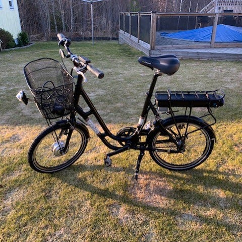 TWS Dynamic med Shimano Nexus 7 vxl. Fotbroms bak, fälgbroms fram. Banfang DP C10 display, klocks på styret, Salle Royal comfortsadel, al-ram vikt 27kg, 10,4 Ah, 374 Wh Li-ion batteri, tektro bromsgrepp, promax styrstam med snabbjustering. Belysning fram och bak, bromsljus bak, pump med tryckmätare. SSF godkänt lås