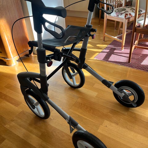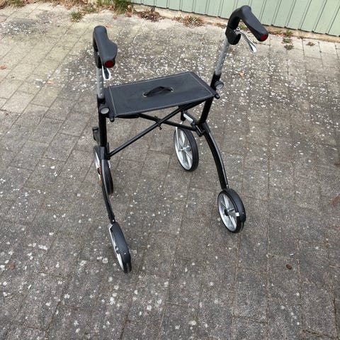 Topro Troja 5G rollator i röd/grå färg. Rollatorn har fyra hjul, ergonomiska handtag med bromsar samt en sits med vadderad dyna. Utrustad med korg/väska framtill för förvaring av personliga saker. Hopfällbar konstruktion som underlättar transport och förvaring. Passar som gånghjälpmedel både inomhus och utomhus.