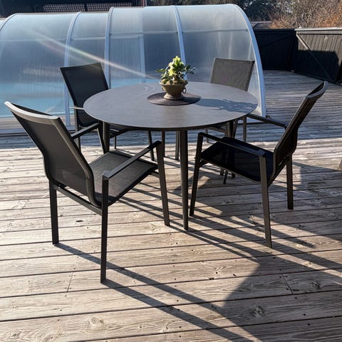 Allt är i mycket fint skick och ger en exklusiv känsla på uteplatsen eller altanen – perfekt för både middagar och avkoppling i solen.