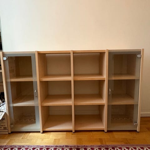 2 stycken hyllsystem ”BOAXEL” från IKEA. Har suttit på väggen ovanför varandra, köptes för ca 1 år sen.