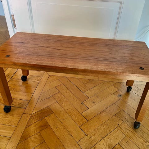 Teakbord 50-tal på hjul – med rottinghylla