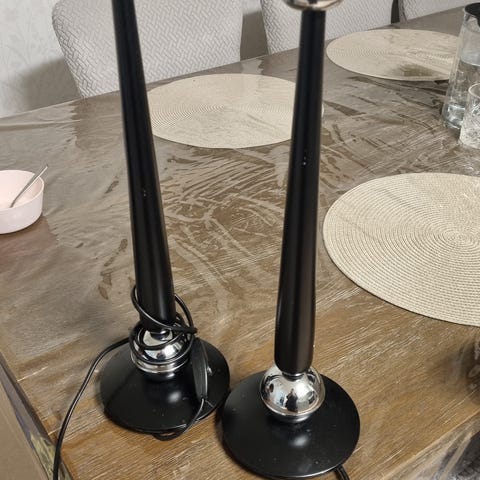 Finnes 2 st oanvända (i kartong) fönsterlampor el sänglampor; Hubble 22 Warm Grey/Beige. Metallhylsa. Man kan välja om ljuskällan ska synas eller gömmas inuti hylsan. Svart vävd sladd. Sladd längd 3,5 m. Sockel E14.
