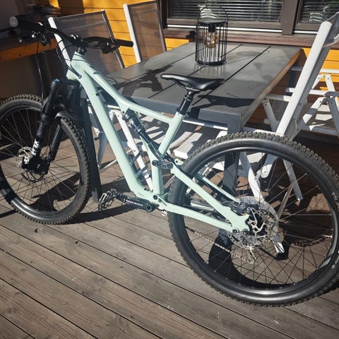 Specialized Stump Jumper FSR Comp heldämpad cykel med ramstorlek XL (kolfiber) och 29" hjul. Mycket få timmar, vi gissar på 40-50timmar, står på originaldäcken.
