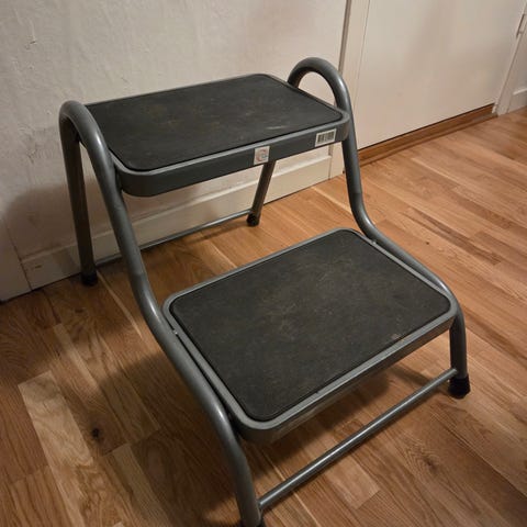 Klassisk stegpall/trappstol/kökspall med nedvikbara trappsteg. Patina/estetiskt slitage enligt bild. Tvärslån har lagats med svets.