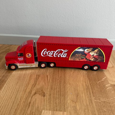 Coca-Cola lastbil som leksaksfordon i röd färg med släp. Lastbilen har tryck med Coca-Cola-motiv och jultema på sidorna av trailern. Modellen var ursprungligen radiostyrd men fjärrkontrollen saknas. Passar för dekorativ modell på hylla eller i samling. 95 cm lång!