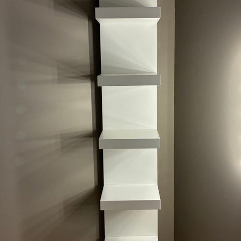 En vägghylla från IKEA (Lack), tidigare hängt i hallen för handskar, mössorna och andra saker som avläggsplats från fickor.