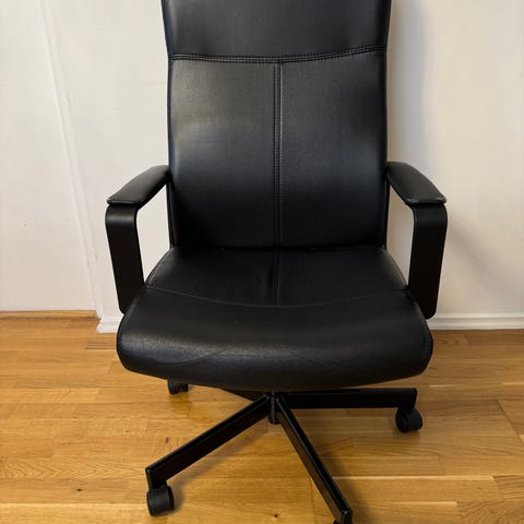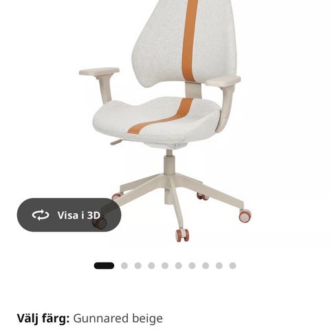 IKEA kontorsstol i svart med röda detaljer på armstöd och hjul. Stolen har sits i tyg, rygg i nätmaterial och femhjuligt kryssunderrede. Höjden är justerbar med gasfjäder. Passar som skrivbordsstol i hemmakontor eller arbetsplats.